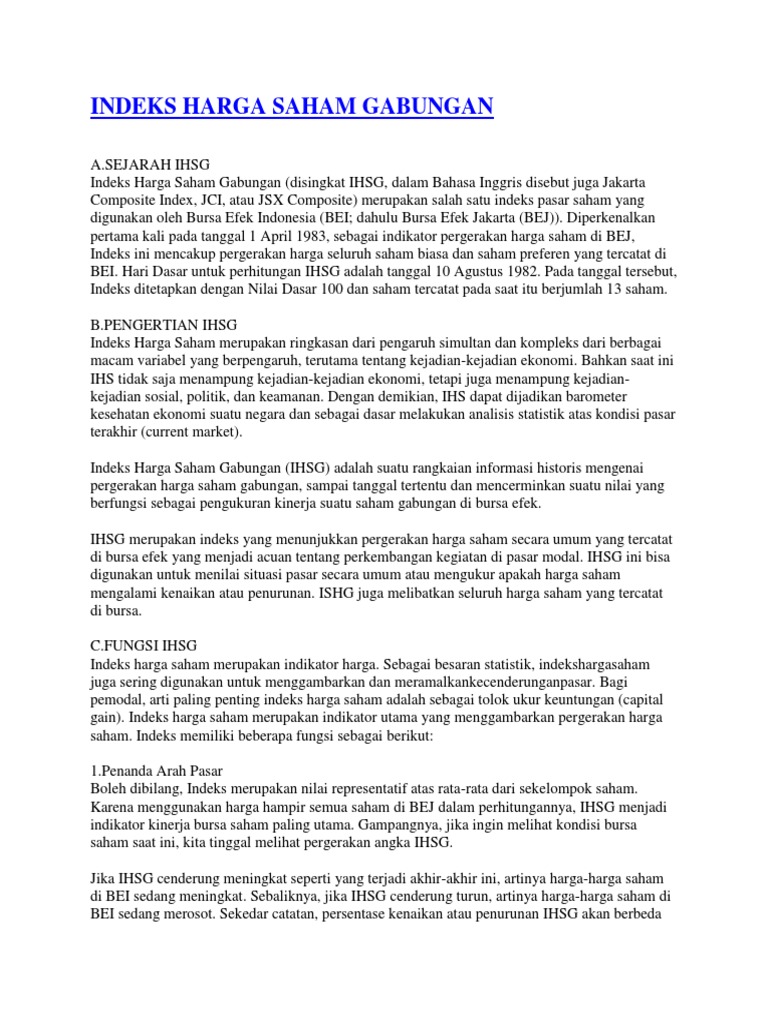 Makalah harga saham. Makalah indeks harga saham gabungan i. Fluktuasi harga saham tersebut akan ditentukan oleh kekuatan penawaran dan permintaan. Indeks yang mengukur kinerja harga dari 80 saham yang memiliki likuiditas tinggi dan kapitalisasi pasar besar serta didukung oleh fundamental perusahaan yang baik.