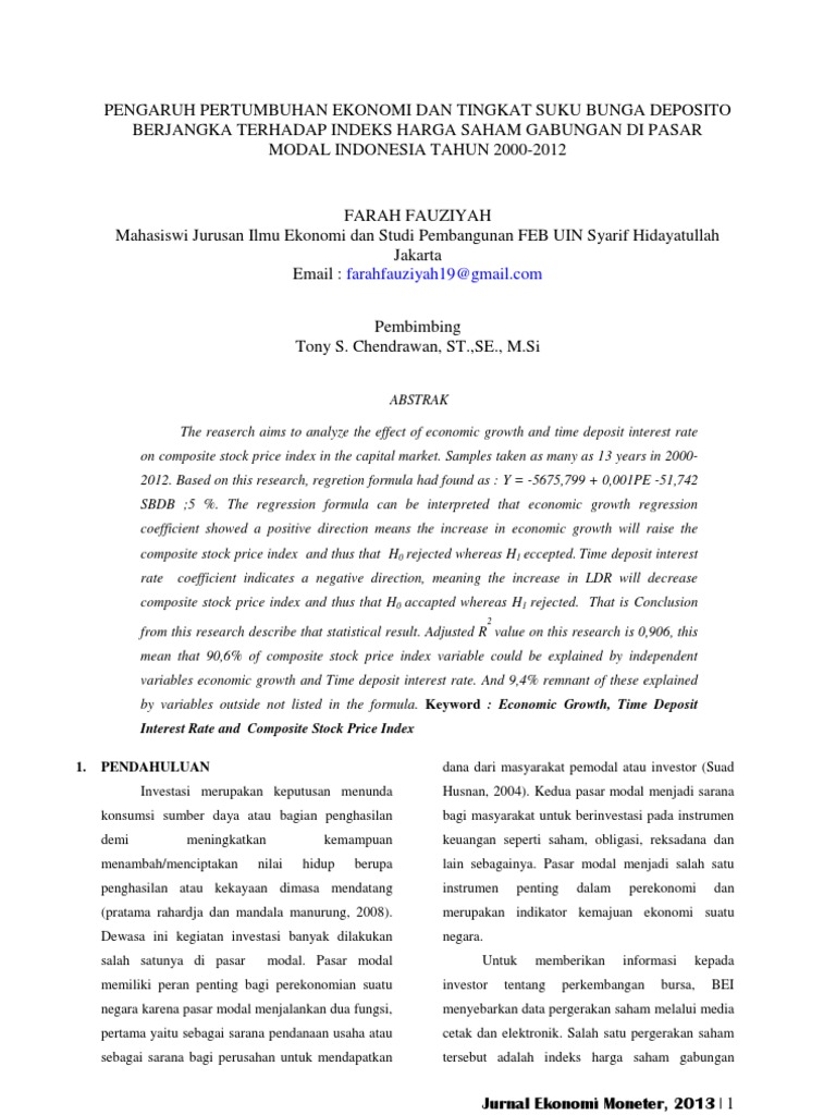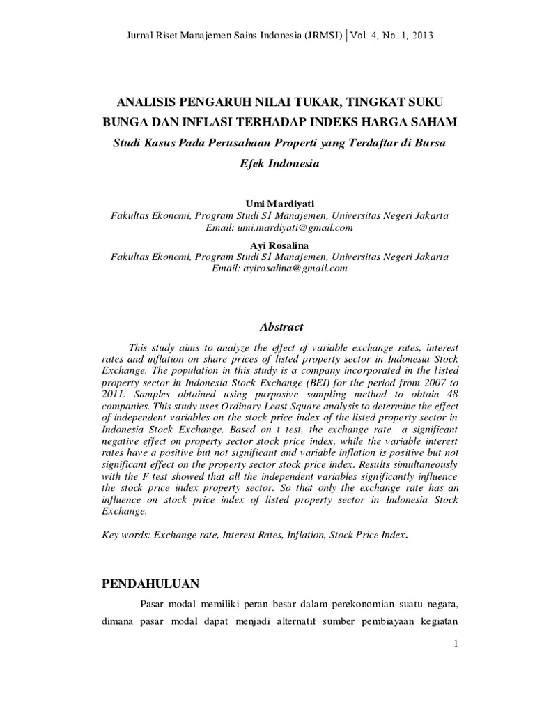 Budiantara program studi akuntansi fakultas ekonomi universitas mercu buana yogyakarta abstract investors need information as a basis for making investment decisions on a particular company. This research has a purpose of knowing the effect of interest rate, exchange rate, inflation, and return onasset. Pengaruh tingkat inflasi, kurs, dan suku bunga bank indonesia terhadap indeks harga saham ali fikri, titing suharti dan diah yudhawati fakultas ekonomi dan bisnis univestitas ibn khaldun bogor, indonesia alifikri30000@gmail.com, titing@gmail.com, diahyudhawati@gmail.com abstract